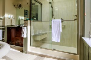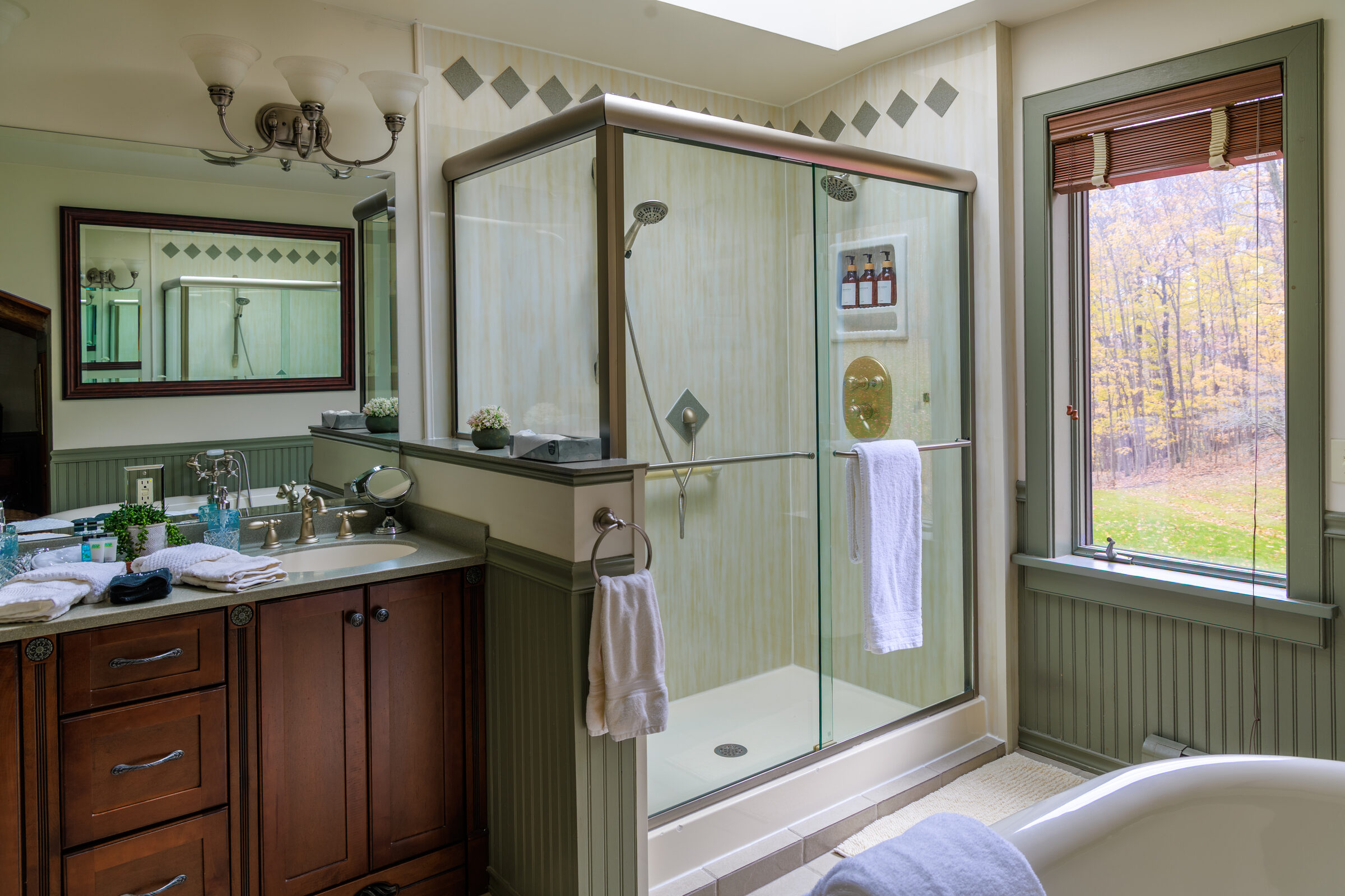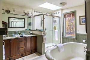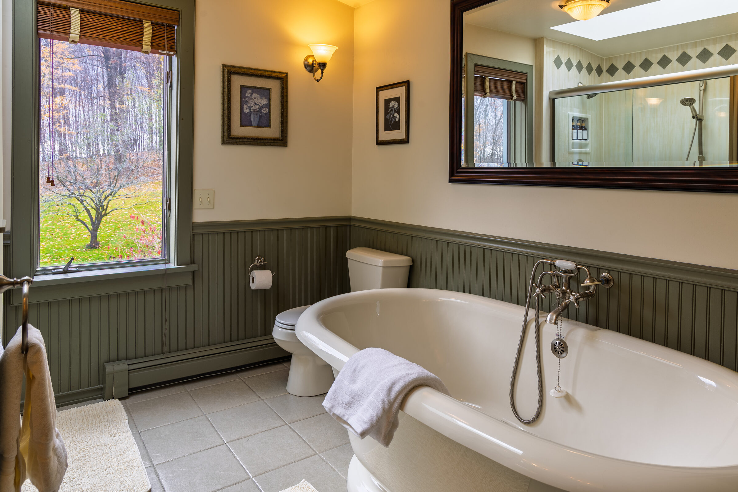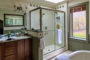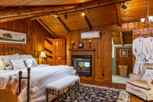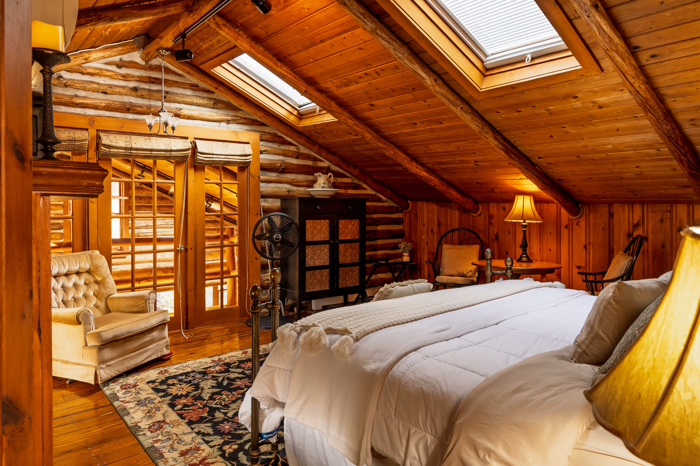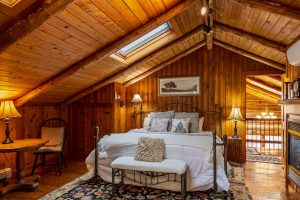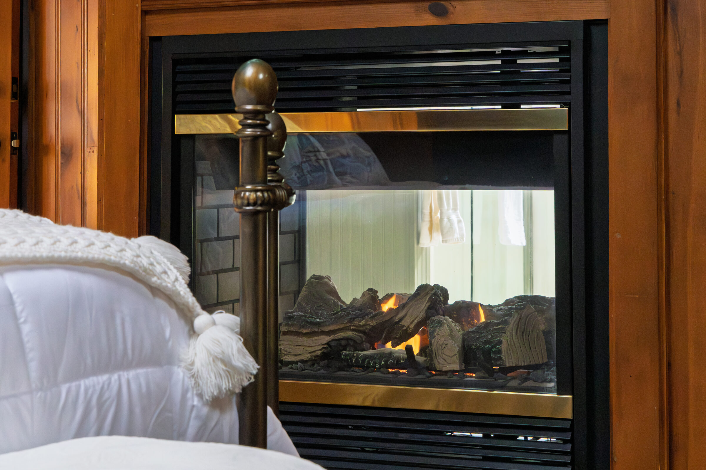 Done in shades of green, gold, and wood tones, it features a king-sized bed with a sunset colored quilt, a cozy sitting area, and a two-sided, see-through fireplace between the bedroom and private bath. A large Victorian soaking tub and a separate walk-in shower with body spray are featured in the spacious bath.